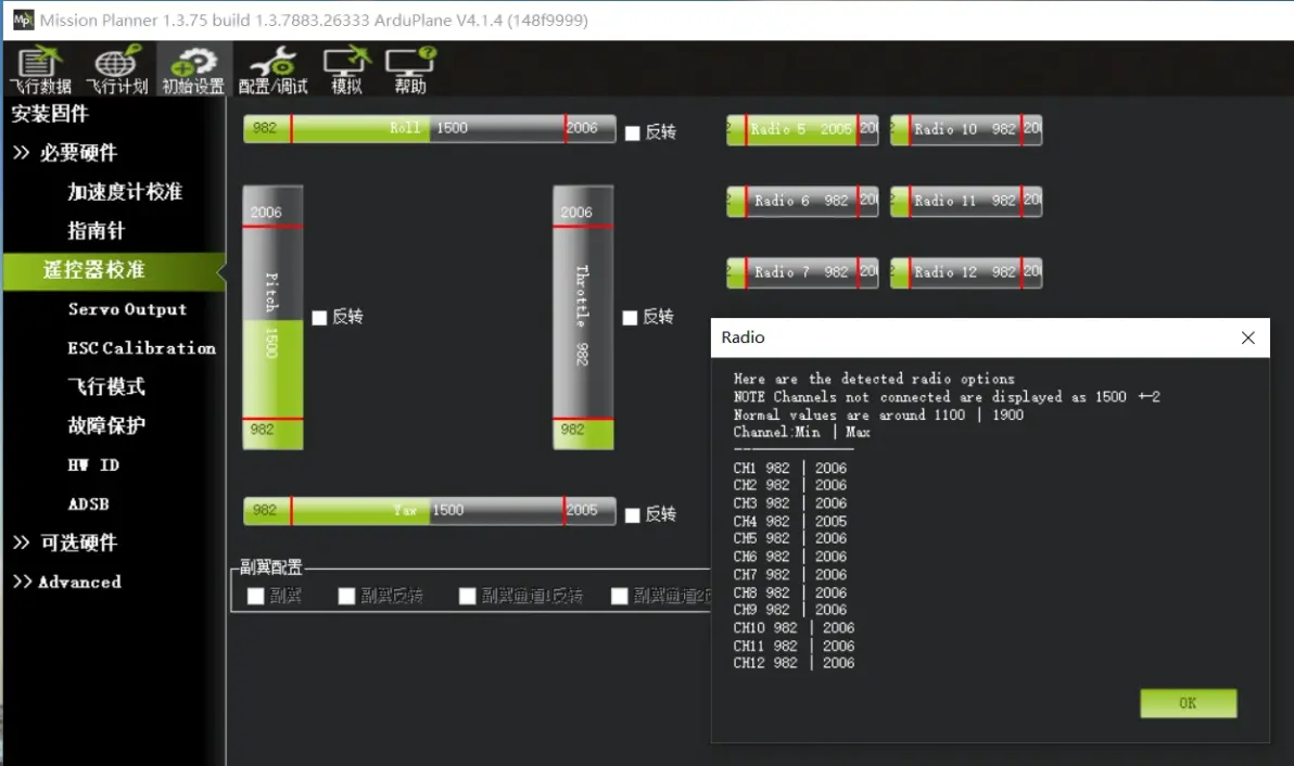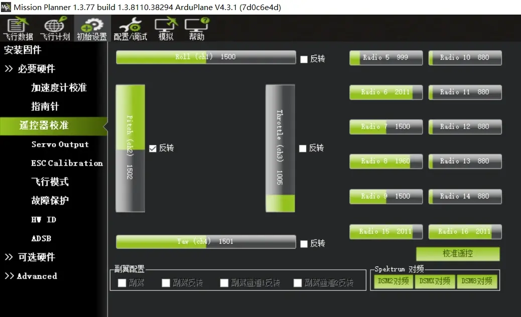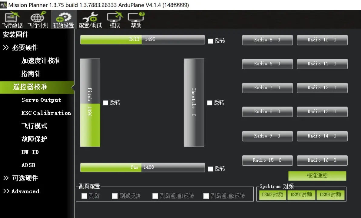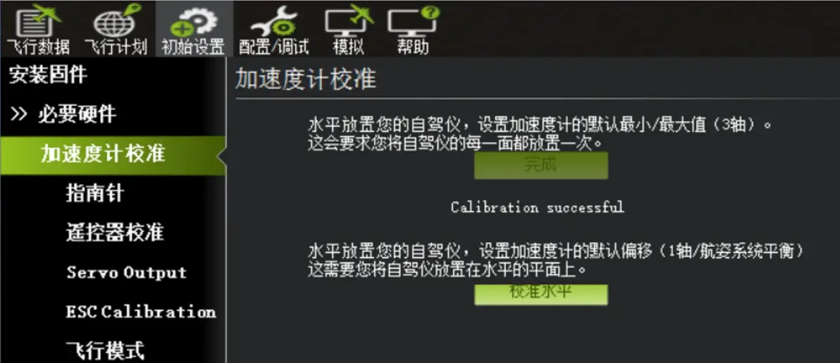 Please place vehicle LEVEL加速计校准–底面朝下 Please place vehicle LEFT加速计校准–左面朝下 Please place vehicle RIGHT加速计校准–右面朝下 Please place vehicle NOSEDOWN加速计校准–前面朝下 Please place vehicle NOSEUP加速计校准–后面朝下 Please place vehicle BACK加速计校准–顶面朝下 校准完成 校准水平,可以在飞控装机后,飞机平放,然后执行一次校准水平即可。 3:遥控器校准。 此时需要接收机与飞控正常连接,飞控有USB线连接电脑的话,需要下板连接动力电池,此时串口5V才有供电,保证接收机工作。 接收机与飞控正常连接并设置正确,在“初始设置”–“遥控器校准”页面,所有通道均有一定的值。特别是油门通道,以及开关通道。如下图: