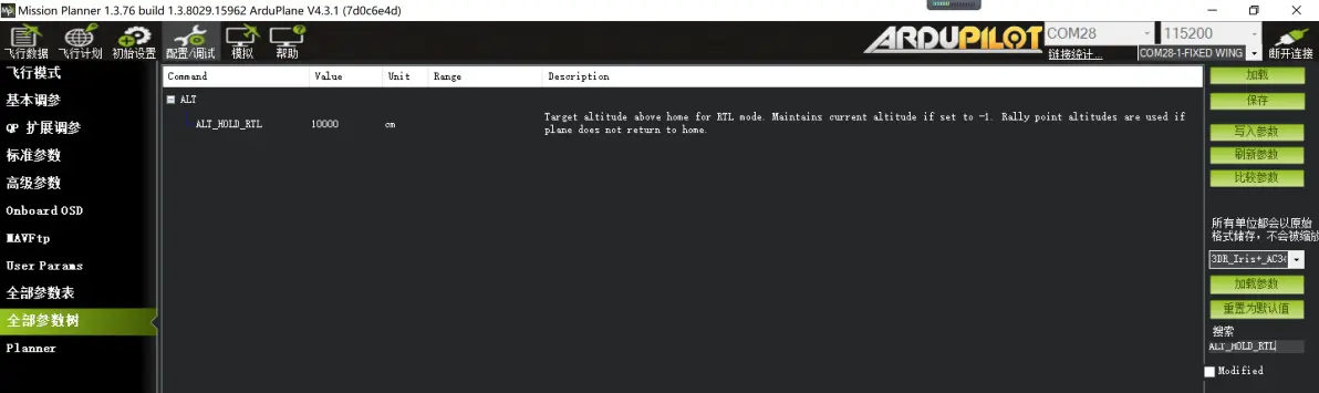 FS_SHORT_TIMEOUT 1.5 (失去接收机油门输出信号1.5秒后,飞控执行第一阶段失控保护动作) FS_SHORT_ACTN 1 (第一阶段失控保护动作,执行CIRCLE盘旋等待。默认为0“不执行任何动作”) FS_LONG_TIMEOUT 5 (执行第一阶段失控保护动作5秒内,没有接受到油门输出信号,飞控执行第二阶段失控保护动作) FS_LONG_ACTH 1 (第二阶段失控保护动作,执行RTH返航。默认为0“执行当前动作”) Ardupilot固件默认返航点盘旋等待高度为100米高,玩家可根据各自飞场的不同地理情况进行调整。RTL返航逻辑为在返航点与起飞点以直线飞行,一边返航一边降低高度。高度不足预设高度会自动快速爬升至指定高度执行返航。修改返航高度参数如下: ALT_HOLD_RTL 10000 cm 默认 10000 cm RTL至起飞点后盘旋高度