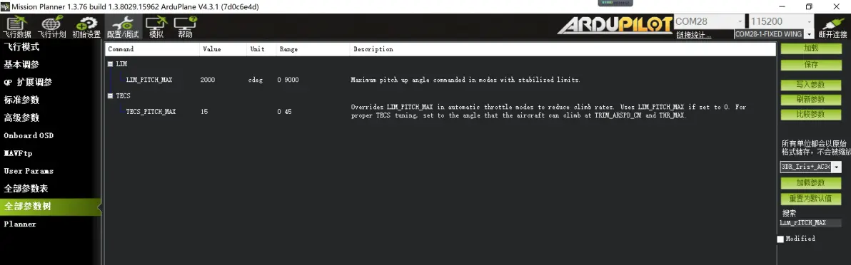 LIM_PITCH_MAX 3500 FBWA模式下俯仰最大比例角度 默认2000 建议修改至3500,修改此项,降低FBWA模式下爬升倾角,提高爬升速率
