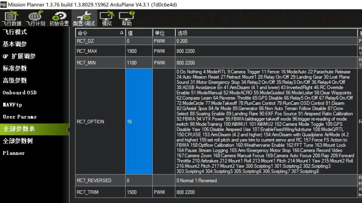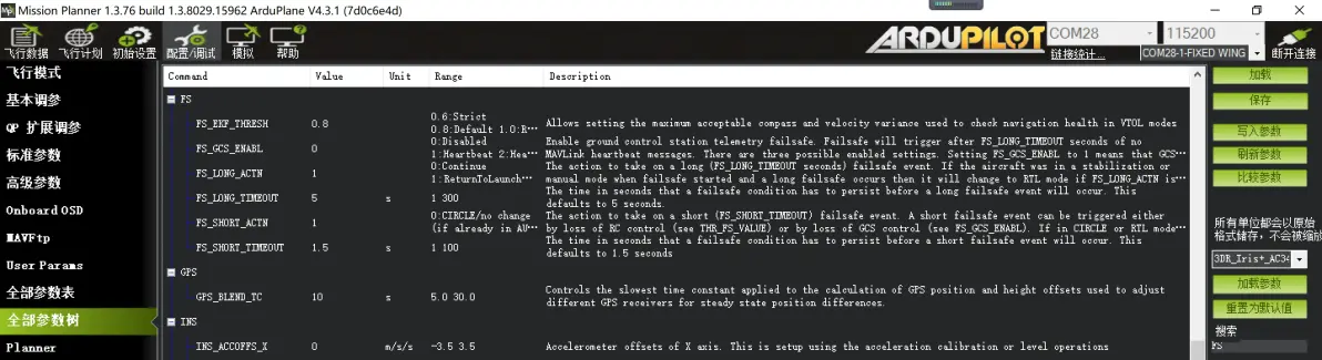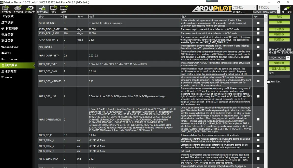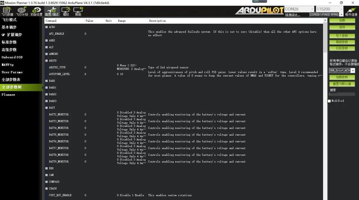 如上图所示,所有OSD项目的XY轴坐标如下: FLTIME 解锁飞行时间 31 17 DIST 飞行航程 2 17 PITCH 俯仰值 47 17 ROLL 横滚值 47 16 GPSLONG GPS经度 41 0 GPSLAT GPS纬度 41 1 VSPEED 当前高度变化值 44 11 COMPASS 罗盘方位 26 0 THROTTLE 当前油门值 5 11 HEADING 离家方位角 25 1 HOME 离家距离 2 16 HORIZON 模拟地平线 26 10 GSPEED 当前地速 4 10 MESSAGE 系统信息 19 6 FLTMODE 当前模式 40 17 SATS GPS卫星数 2 0 BATUSED 电量消耗 17 17 CURRENT 电流 12 17 RSSI 遥控信号强度 8 0 BAT_VOLT 电池电压 24 17 ALTITUDE 当前高度 43 10 7:电调油门行程校准 装机后需要对电调进行连接飞控状态的油门行程校准操作。油门校准须确保卸除螺旋桨,保证电机工作是无磕碰到周边物体。 具体操作: 将飞控通过USB线连接电脑,打开MP调参软件,连接飞控。 在“飞行数据“—”动作”—点击“解锁/锁定”–遥控油门推到最高–电调 连接动力电池–等待电调检测电池123声音(不同的电调声音有可能不同)–油门拉到最低–电调确认油门最低值 滴一声长响。此时完成油门行程校准操作。 第四节,进阶调参(重要) 其他参数更多是在“全部参数表”“全部参数树”里面进行针对性设置,这是ardupilot固件最具有特点地方。“全部参数表”内容密集,如下图: