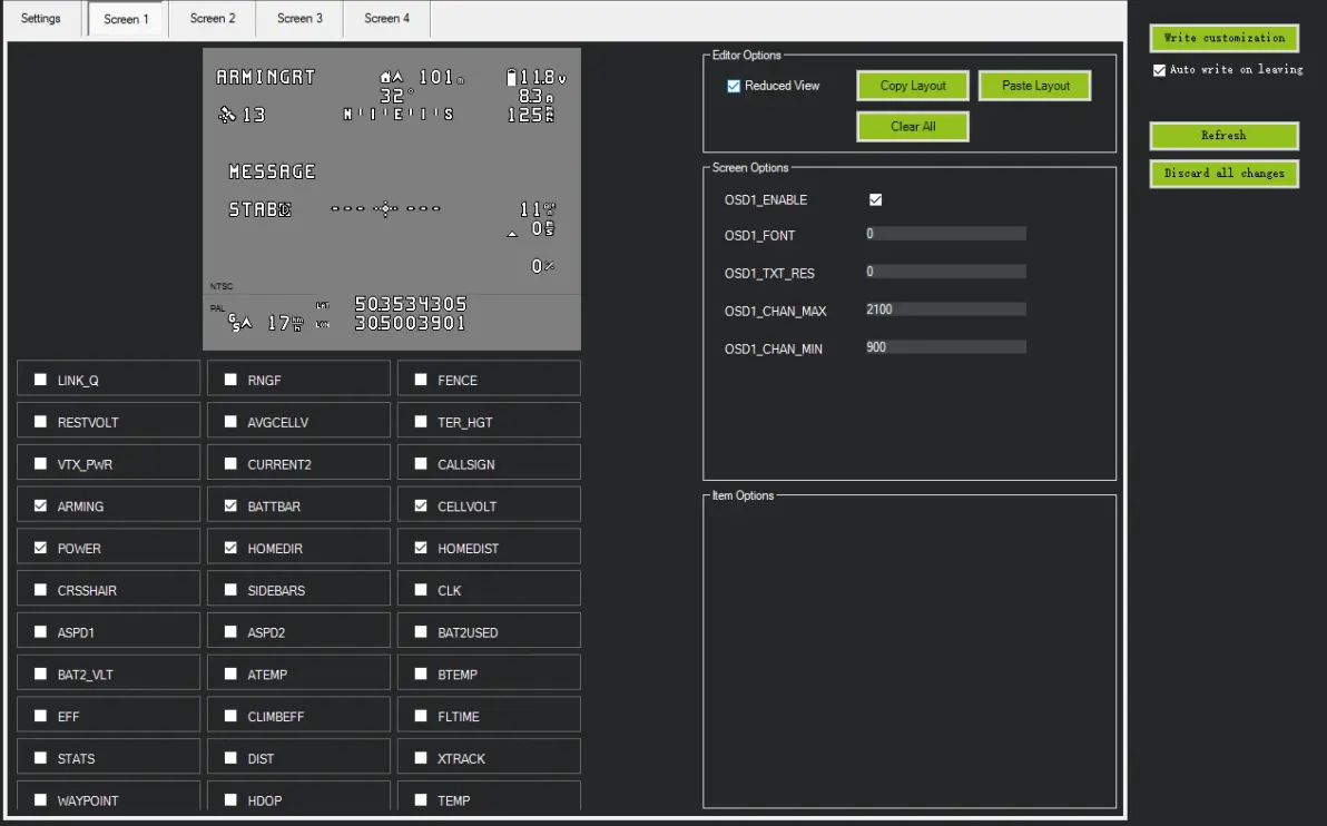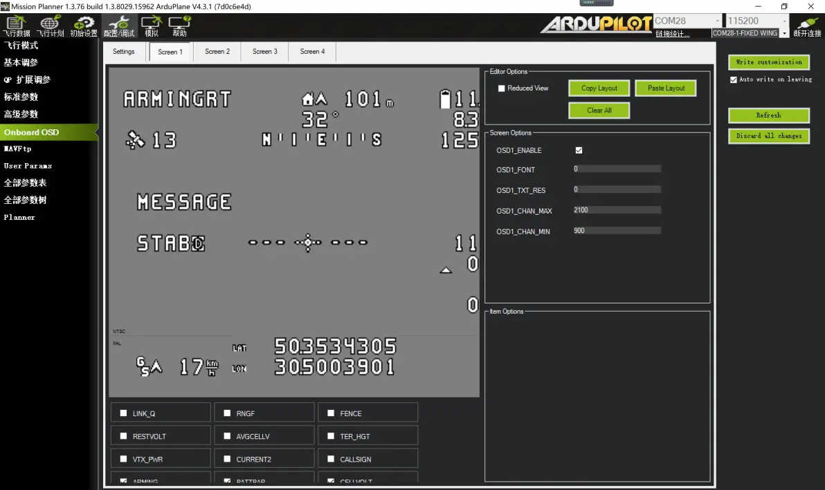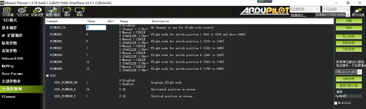 以下是常见独立开关控制模式对应的参数 4: ModeRTL 返航模式 16: ModeAuto 航点模式 41: ArmDisarm (4.1 and lower) 开关一键解锁(4.2版本固件前) 51: ModeManual 手动模式 56: ModeLoiter 定点留待模式 58: Clear Waypoints 航点清除 72: ModeCircle 盘旋模式 77: ModeTakeoff 抛飞模式 92: FBWA 增稳模式 150: CRUISE 定高定向模式 153: ArmDisarm (4.2 and higher) 开关一键解锁(4.2版本固件起) 6: OSD设置(模拟图传,DJI高清,avatar高清) 进入OSD信息设置: 配置/调试–Onboard OSD–Screen1 Ardupilot的OSD显示设置与INAV调参有些类似(飞控内置OSD模块),属于最下面的OSD内容选项中勾选需要显示的项目,在页面中拖动到自己想 要的位置即可。飞控通电并接入图传与摄像头时,拖动OSD项目的位置,点击右上角“Write customization”,即可在接受屏幕中看到OSD信息位置的更新。如下图所示: