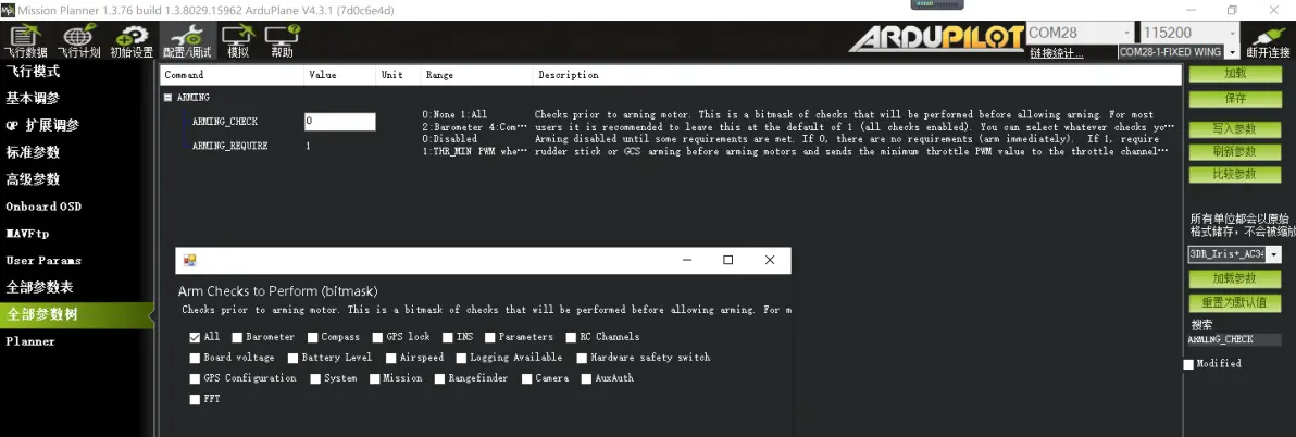 5:解锁自检 Ardupilot固件对飞控解锁要求非常高,默认参数需要自检数十项参数后达标才允许解锁,非常麻烦。(搜索ARMING)