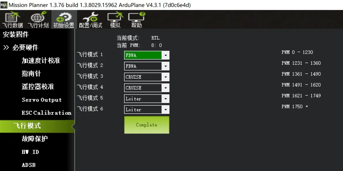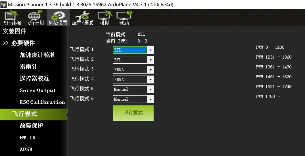 每一段模式,都可以在下拉菜单中进行选择对应的模式: 根据众多模友的一致推荐选择,固定翼推荐大家使用以下模式设置(确保遥控6段开关模式切换正常) 六段开关推荐设置模式:1,RTL返航模式。2,FBWA增稳模式。3,CRUISE巡航模式。4,AUTO自动航点模式。5,LOITER留待模式。6,MANUAL 手动模式 根据下拉菜单选择对应的6个模式,最后点击“保存模式”即可。如下图