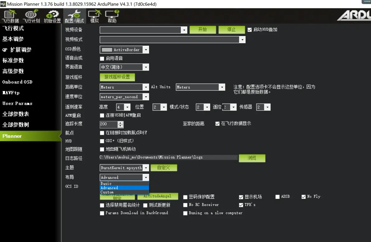 部分安装了MissionPlanner调参软件的用户在软件界面中找不到“全部参数表”“全部参数树”项目,可以在“配置/调试”页面下的“Planner”页面下的“布局”项目,选择“Advanecd”,然后保存,关闭软件,重新打开并连接飞控,即可找到“全部参数表”“全部参数树”项目页。如下图