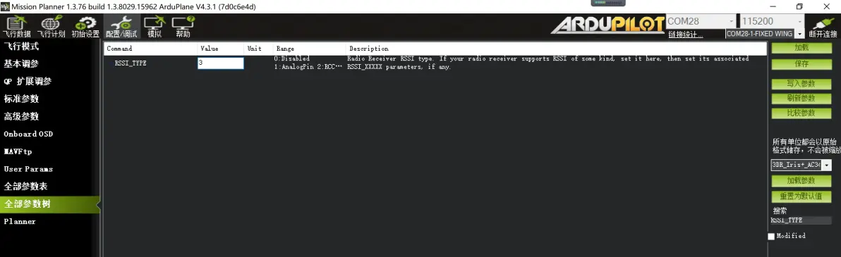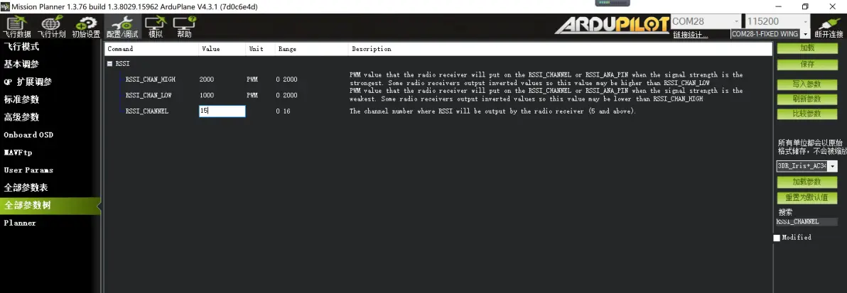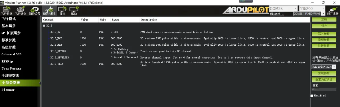思翼接收机,设置为 RSSI_CHANNEL 16 CRSF接收机,设置为 RSSI_CHANNEL 12 ELRS接收机,设置为 RSSI_CHANNEL 15 由于在遥控器校准中,遥控信号始终处于满格状态,导致思翼接收机对应的16通道(黑羊CRSF接收机对应12通道,ELRS接收机对应15通道)的最大值与最小值始终处于2000状态,所以我们需要修改这个通道的最大值与最小值,确保RSSI数据反馈范围的正确。 以下用ELRS接收机对应的RSSI通道:15通道 进行设置。全部参数表中搜索:RC15 如下图 (思翼接收机搜索RC16, 黑羊接收机搜索 RC12)