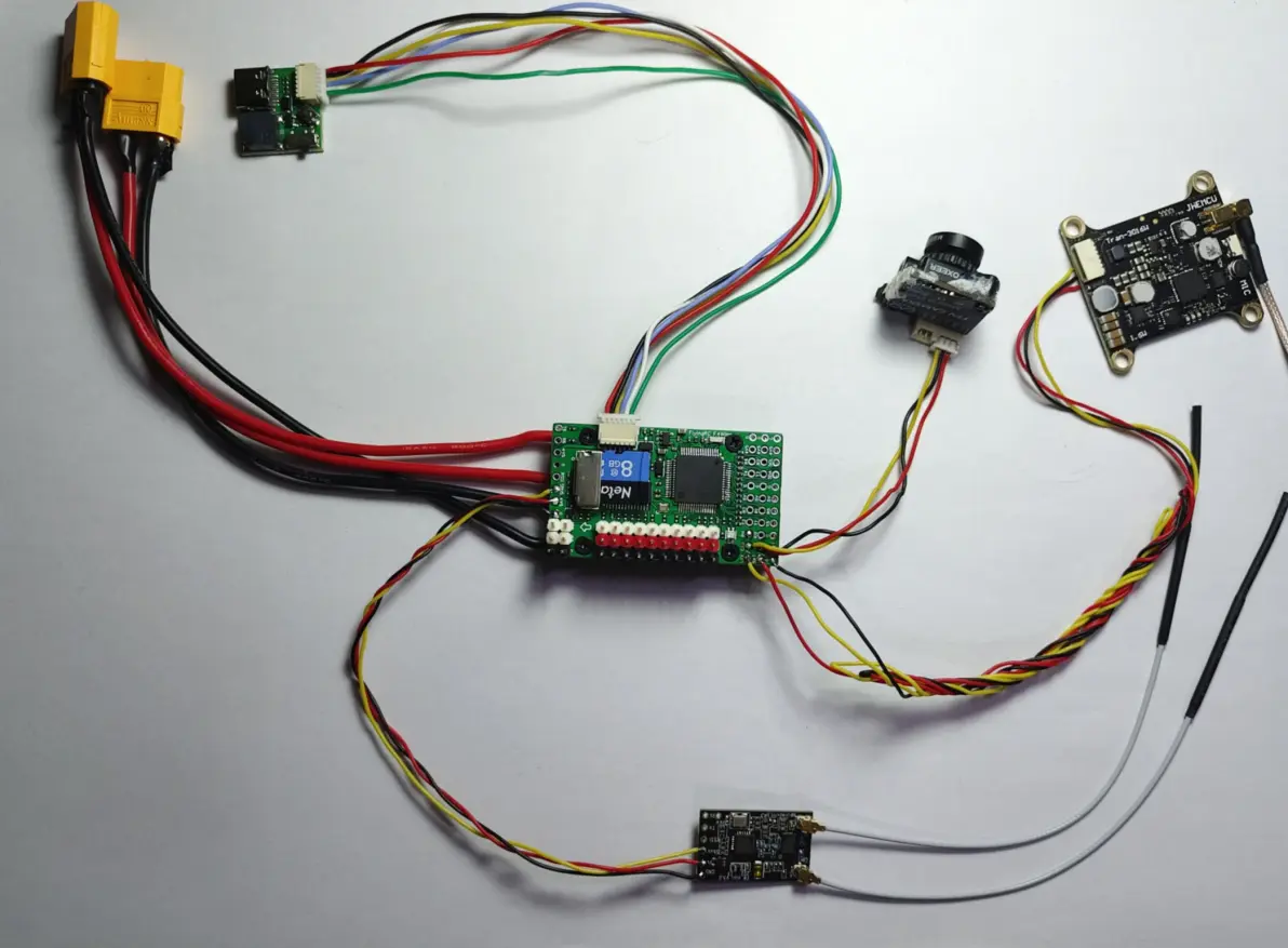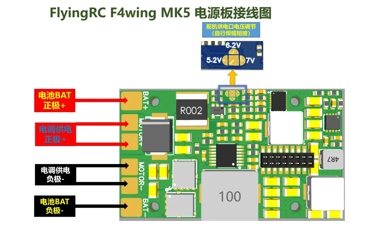 通过实测,飞控6个可用串口,除了TX1RX1(对应serial1)不能使用ELRS接收机,连接GPS模块及DJI天空端均正常。其他5个串口均能正常使用ELRS接收机、GPS模块、DJI天空端(根据连接设备修改串口定义即可)。使用Avatar高清天空端推荐使用UART5(对应serial3)接口,可以排除飞行OSD卡死故障。 5、飞控的5.8G模拟图传及摄像头供电接口处于独立区域,同样使用2.54杜邦插针。其中中间的供电电压为9V,可以正常给模拟图传及摄像头、DJI高清天空端进行供电。 FlyingRC F4Wing MK5 飞控推荐接线图如下: