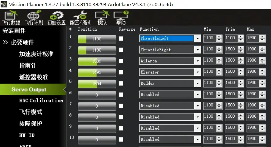 每个PWM输出通道都可以在对应的下拉菜单中选择定义,这是Ardupilot固件最有特点的地方之一 使用双发固定翼,建议两个电调的信号线直接接入飞控,而不是使用Y线将电调信号线并联后接入飞控(Y线并联电调信号线有可能出现某个电调接收不到信号的故障) 双发传统布局固定翼设置指导如下图:(大白鲨,肥翁,铁骑,龙2,刺客T1此类)