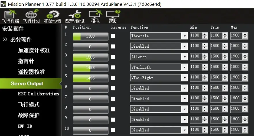飞机舵面校准: FlyingRC F4Wing MK5 飞控需要下板连接动力电池,舵机才能正常通电并工作。 Ardupilot固件的通道输出为实时输出,后期进行通道辅助修正调整的时候,发现飞控执行飞机姿态修正的时候,通道输出方向错误,在对应通道的"Reverse"处勾选,对应通道的输出即可反向。通道辅助检查请在FBWA增稳模式下操作, 例如左边机翼向上,则左边的副翼舵面应向上打来对左边机翼姿态进行修正,反之右边机翼校准检查也是一样。如下图