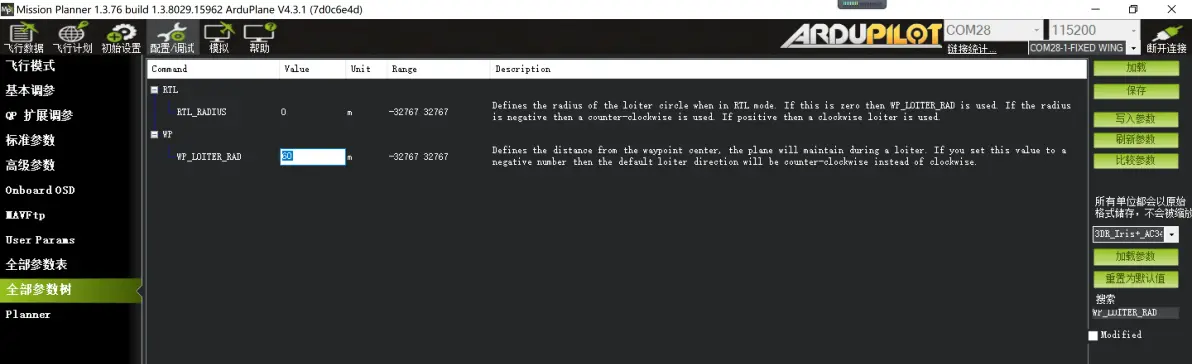 飞机返航到起飞点上空后进行盘旋等待,相关盘旋参数也可以进行修改设置 WP_LOITER_RAD 80 留待模式盘旋半径,默认60m 参数为正数+,飞机盘旋时做顺时针盘旋,参数为负数-,飞机盘旋时做逆时针盘旋