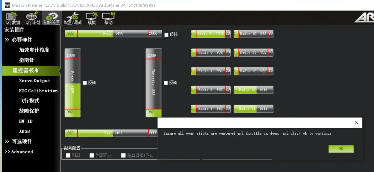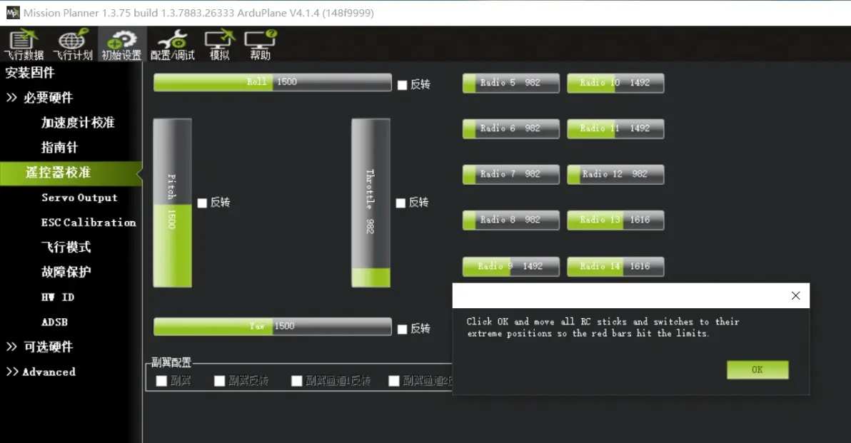 弹出对话框“Click OK and move all RC sticks and switches to their extreme positions so the red bars hit the limite”旨在提示点击该OK栏后,注意将所有通道的遥感打满,开关通道及6端开关通道打满,确保看到通道显示红色栏为通道输出的最大值及最小值。 点击OK。如下图: