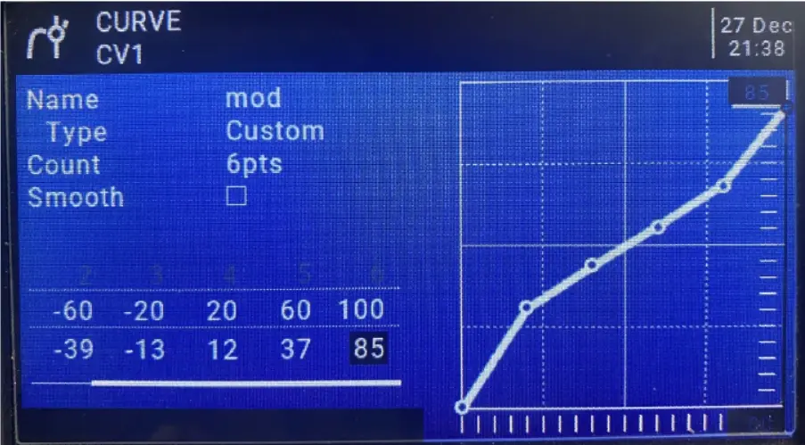 若舵面修正的反向有误,在对应通道的Reverse栏勾选反向。直至所有舵面辅助修正方向正确。 检查完飞控自稳模式的舵面辅助修正方向,在遥控上切换到手动模式,通过打俯仰,升降,方向,检查飞机的舵面反馈是否正确。 若飞机舵面在手动模式下舵面反馈方向错误,在“遥控器校准”界面,选择对应的摇杆通道,勾选对应通道的“反转”选项即可。 5:设置飞控的飞行模式 Ardupilot使用1个比例通道进行6个模式切换,目前市场上有遥控原带6段开关(例如Jumper T16,T18,TPro,Radiomaster TX16S等),不过这个六段开关的输出范围与Ardupilot的6个模式的范围区间不太一致,建议在遥控的6段比例通道中加入一个曲线,参数为: 6段开关曲线设置 -100 -60 -20 20 60 100 -85 -45 -15 15 45 85 如下图: