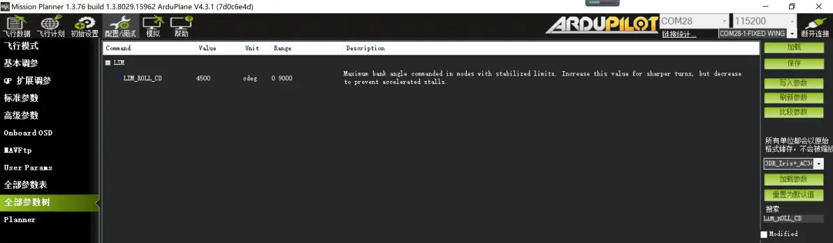 一般玩家都会直接在右边的“搜索”栏里输入命令关键字,这样能提高找到命令的速度。一般情况我会搜索前3个字母,这样能更好的提高调参速度。 每一项命令,第一列为命令名称,第二列为值,第三列为单位,第四列为选项,第五列为描述。我们会搜索命令,然后鼠标点击对应的值的数字,输入我们需要设置的值。部分命令会弹出对话框,关闭或者忽略即可。命令的值修改完成,点击右边“写入参数”,弹出“Parameters successfully saved”对话框,点击OK即可。此时你要修改的命令的值已经完成更新。 1:FBWA模式下参数微调 搜索LIM LIM_ROLL_CD 6000 FBWA模式下横滚最大比例角度 默认4500 建议修改至6000,修改此项,降低FBWA模式下横滚转弯的半径