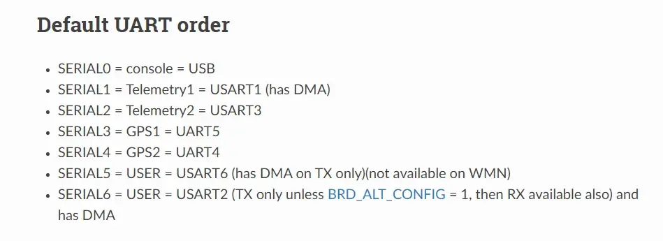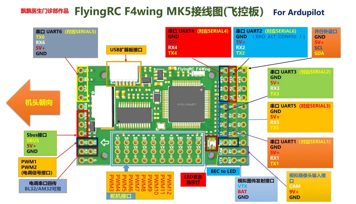 硬件安装: 固定翼载机的电子设备安装请参考空机厂家提供的指导说明书,包括电调,电机,舵机安装的方法和技巧,这里不作赘述。 飞控安装到飞机机舱,不需要特别加减震平台,正常使用3M海绵双面胶粘在机身中心即可。确保安装稳固,较大的晃动下不会出现飞控松脱。 第一节:飞控前期准备 1、 FlyingRC F4Wing MK5 飞控 ,目前支持Ardupilot固件,重点针对固定翼设计,已预刷4.3.1稳定版,用户无需刷写固件。所有外设接口均使用标准2.54杜邦插针接口。 2、飞控标配 PWM1~12个端口控制输出。PWM3~12排针中间的5V不与飞控自身的5VBEC供电不连通,由电流计下板的针对舵机专用的BEC 5V10A的BEC供电,确保舵机供电正常。 3、飞控标配 UART1、UART2、UART3、 UART4、UART5、UART5 共6个可用串口,1个i2c外设并联口。独立SBUS信号接口,Ardupilot固件在SBUS接口识别上能自动识别PPM、SBUS接收机。其中UART2、UART4、UART6串口的5V供电在连接USB口供电时可提供5V设备供电,UART1、UART3、UART5 串口的5V供电须电流板连接动力电池供电。 4、飞控UART串口与Ardupilot固件对应的Serial口的定义并非按照数字12345依次对应,根据Ardupilot针对该飞控的串口定义,如下图: