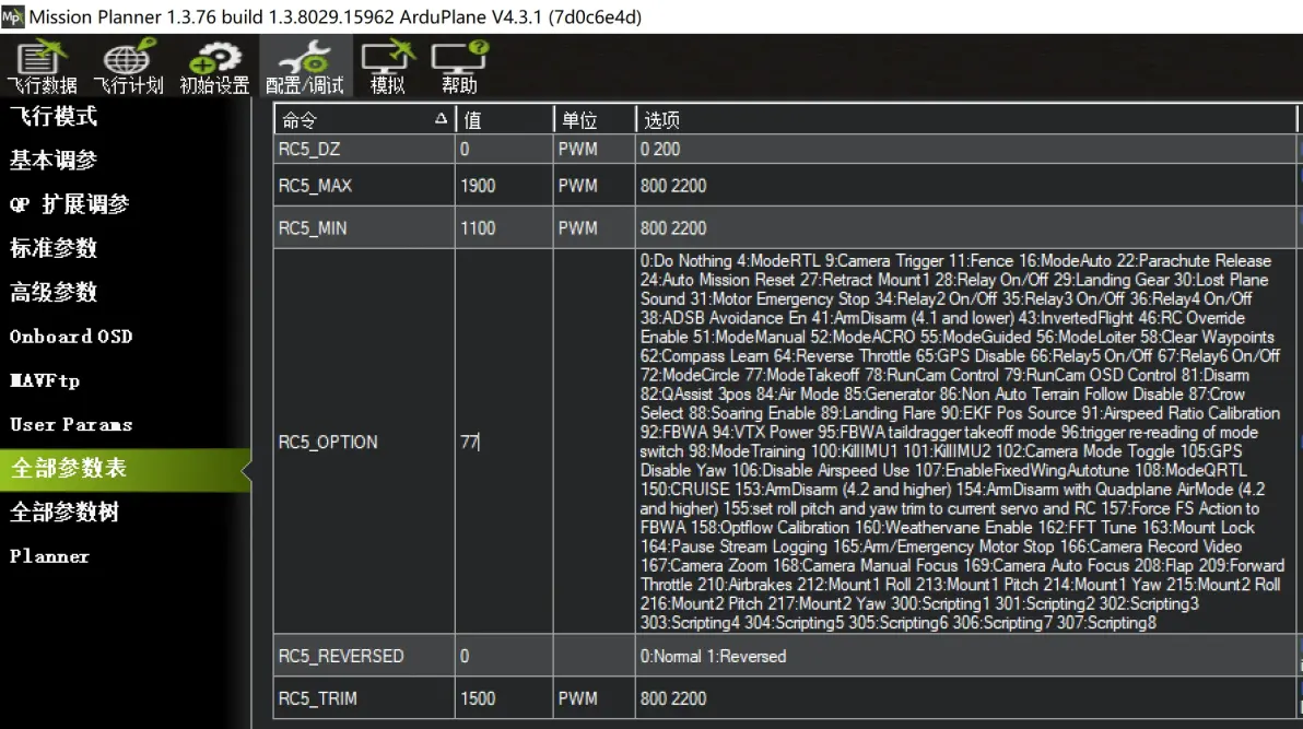 2, 抛飞TAKEOFF模式设置(带机轮滑跑起飞机型不推荐使用) 遥控执行解锁,轻推油门,电机转动,确认电机状态正常,收完油门,打开抛飞辅助模式,将飞机抛出后有一定速度后电机会快速启动并按照指定油门值爬升 RC5_OPTION 77 (设置5通道开关为TAKEOFF起飞模式开关,搜索RC5)如下图:
