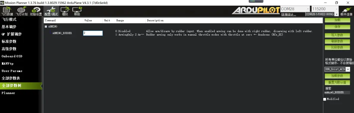 ARMING_CHECK 0 (此处会弹出对话框,关闭即可) 解锁自检,忽略所有要求。用户可以在油门最低,Yaw方向舵右打满6秒后,飞控解锁,推油门电机转。 设置参数 ARMING_RUDDER 2 飞机落地后,Yaw方向舵左打满6秒,飞控锁定,此时推油门电机不转。