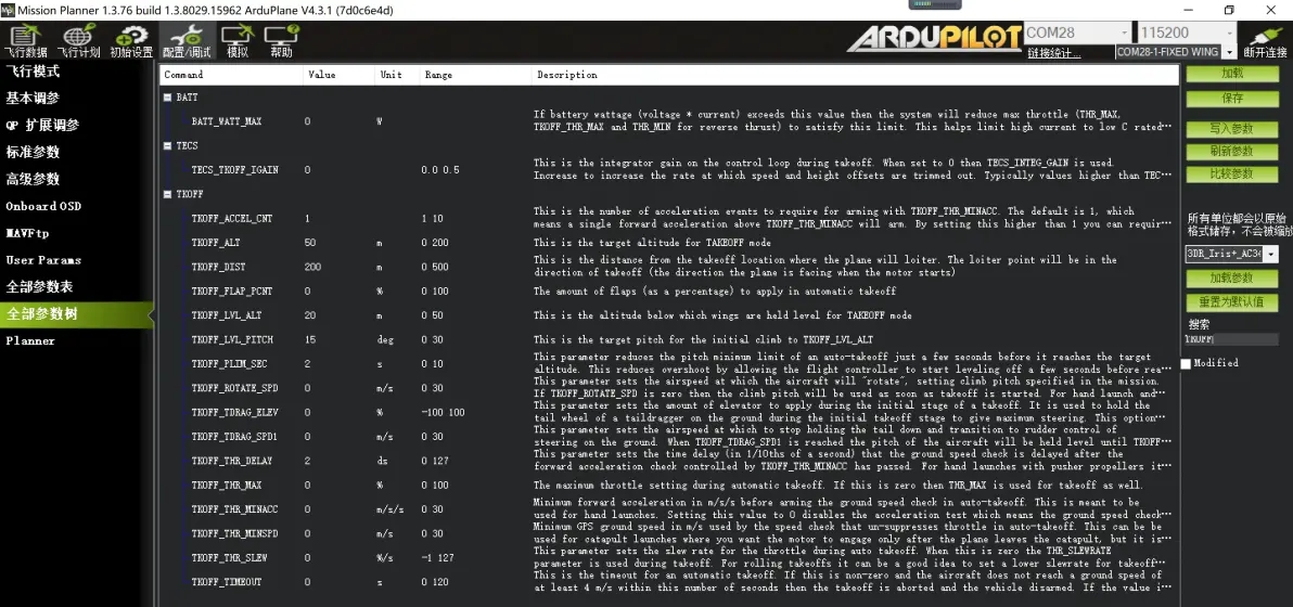 全部参数表,搜索TK 默认参数 建议修改参数: TKOFF_ALT 100 (设置起飞模式目标到达指定高度100米) TKOFF_DIST 400 (设置起飞模式最大范围 400米) TKOFF_LVL_ALT 50 (抛飞后指定高度机翼保持水平,默认20) TKOFF_LVL_PITCH 20 (设置起飞模式最大爬升角度 20°) TKOFF_THR_MAX 100 (设置起飞模式最大油门值100%) TKOFF_THR_MINACC 3 (起飞模式飞控检测飞机瞬间速度达到3米/秒,油门输出) 如下图: