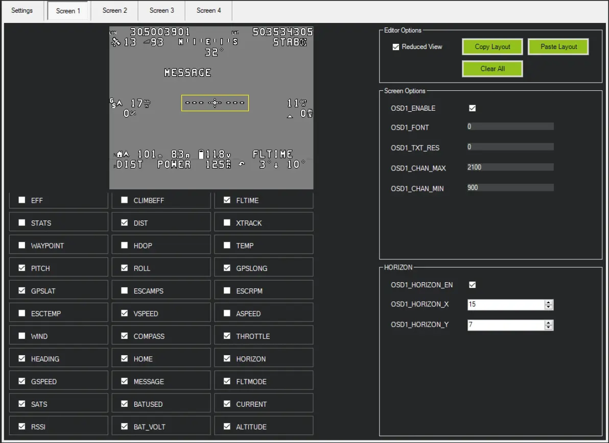 使用DJI高清天空端及V1 V2高清眼镜,设置时须确认天空端供电正常,眼镜连接正常,并且大疆眼镜打开“自定义OSD”,即可显示眼镜所支持的OSD显示类型。 DJI眼镜部分OSD项目不能支持显示。已知常用的可以显示的为: 电池电压,电流,电量,GPS星数,经纬度,离家距离,高度,高度变化值,速度,RSSI,俯仰角,横滚角。 确认不支持显示的是: 模拟水平线,航程累计,离家方位角,模式名称,当前油门量。 模拟图传OSD内容对照: BAT_VOLT 电池电压 CELLVOLT 单节电池电压 CURRENT 电流 POWER 当前系统功率 BATUSED 电量消耗 RSSI 遥控信号强度 SATS GPS卫星数 FLTMODE 当前模式 MESSAGE 系统信息 HORIZON 模拟地平线 HOME 离家距离 DIST 飞行航程 HEADING 离家方位角 THROTTLE 当前油门值 COMPASS 罗盘方位 GPSLAT GPS纬度 GPSLONG GPS经度 ROLL 横滚值 PITCH 俯仰值 ALTITUDE 当前高度 GSPEED 当前地速 VSPEED 当前高度变化值 m/S DJI数字图传(V1/V2眼镜)OSD内容对照: BAT_VOLT 电池电压 CELLVOLT 单节电池电压 CURRENT 电流 POWER 当前系统功率 BATUSED 电量消耗 RSSI 遥控信号强度 SATS GPS卫星数 MESSAGE 飞行模式 HOMEDIR 指向家箭头 HOMEDIST 离家距离 CRSSHAIR 中心十字瞄准 SIDEBARS 战机模式侧边栏 GPSLAT GPS纬度 GPSLONG GPS经度 ROLL 横滚值 PITCH 俯仰值 ALTITUDE 当前高度 GSPEED 当前地速 VSPEED 当前高度变化值 m/S Avatar阿凡达高清数字天空端(使用DJI O3天空端设置相同) OSD显示使用MSP-displayport显示模式, 原来OSD调参页面已经无法满足拖拽来调整OSD所在屏幕的位置。若不进行特别调整,屏幕右半部分及下半部分无法放置OSD信息。 我们可以通过调整对应OSD项目的XY坐标轴来调整对应项目所在屏幕的位置。如下图所示: