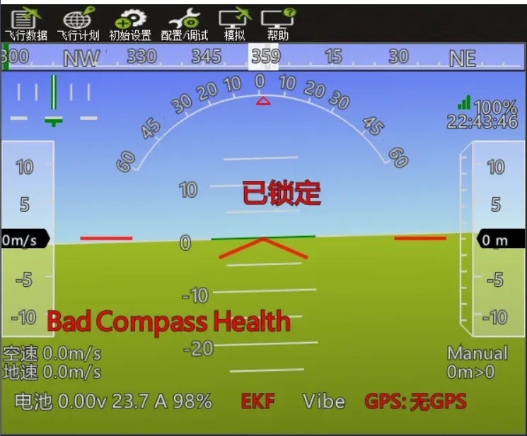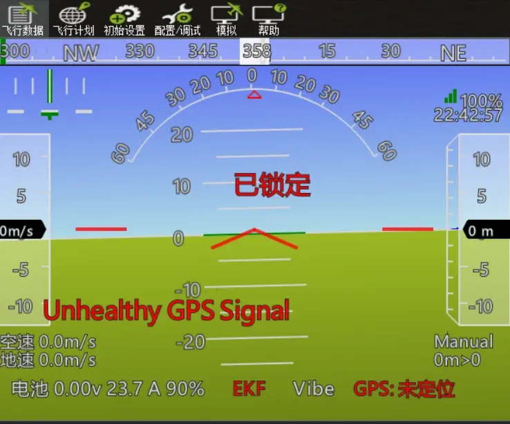 GPS模块连接正确并设置正确,在“飞行数据”页面,可以看到“GPS未定位”,如下图: