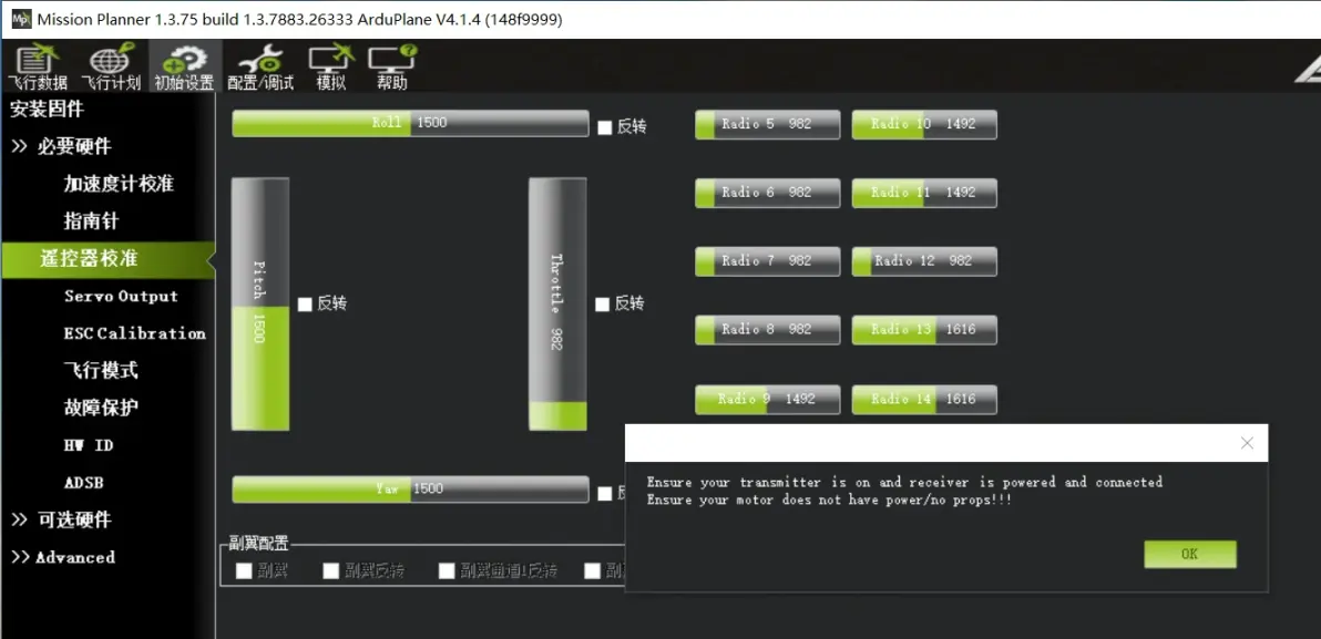 串行接口接收机(SBUS,ELRS,CRSF)设置请参考本文第四节第6项详细说明。 点击“校准遥控”弹出对话框”Ensure your transmitter is on and receiver is powered and connected。Ensure your motor does not have power/no props!!!”旨在提示请确认遥控器油门通道的方向,以及确保电机未接电及未安装螺旋桨。点击OK。如下图: